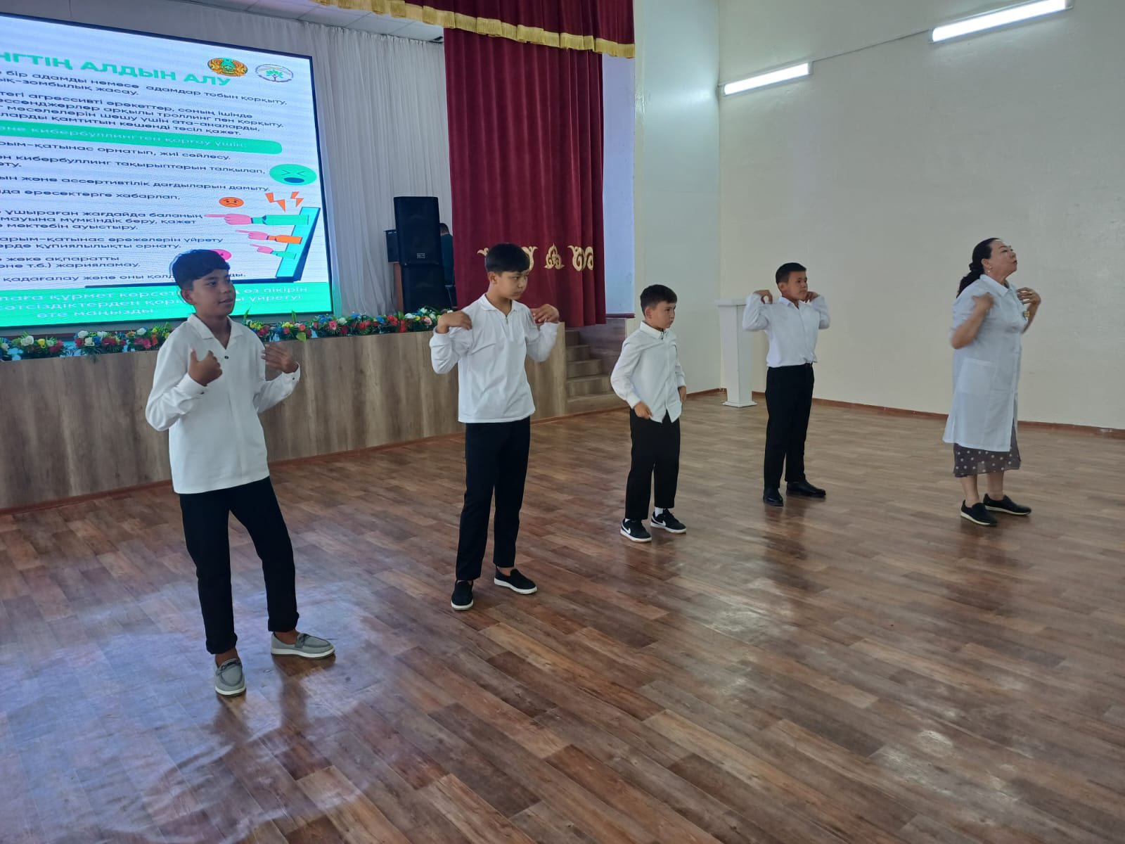 СӨС маманы Махмудова Жамиля, мектеп мейірбикесі Утепбаева Айгүл,  тәрбие ісі жөніндегі орынбасары Дарбаева Бақытжамал және психолог Абиева Бағдагүл осы тақырыптарды қамти отырып, буллинг және кибербуллинг мәселелері туралы  кеңінен түсіндірме жұмысын жүргізді.